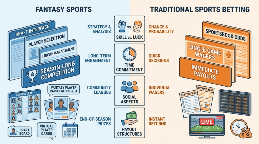 Both fantasy sports and traditional sports betting offer unique ways to engage with sports, with fantasy sports emphasizing team management skills and statistical analysis, while traditional sports betting focuses on predicting game results. Each option appeals to different preferences, whether it’s the strategic challenge of fantasy sports or the excitement of betting on game outcomes.